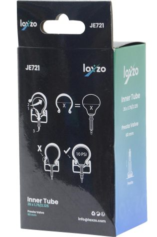 The ideal solution for 26-inch wheels with deep-section rims. This Laxzo inner tube features an extra-long 60mm Presta valve, ensuring easy pump access on any rim profile. Made from tough, puncture-resistant butyl rubber, it fits 26″ tyres from 1.75″ to 2.125″ wide.